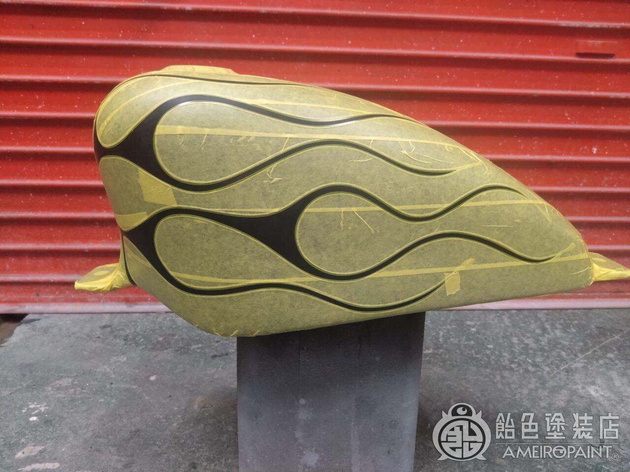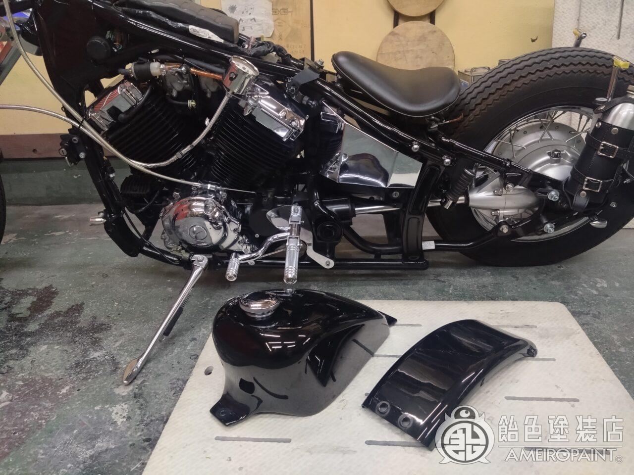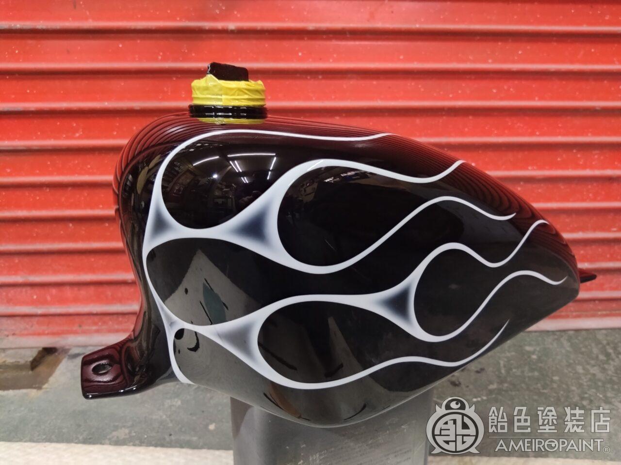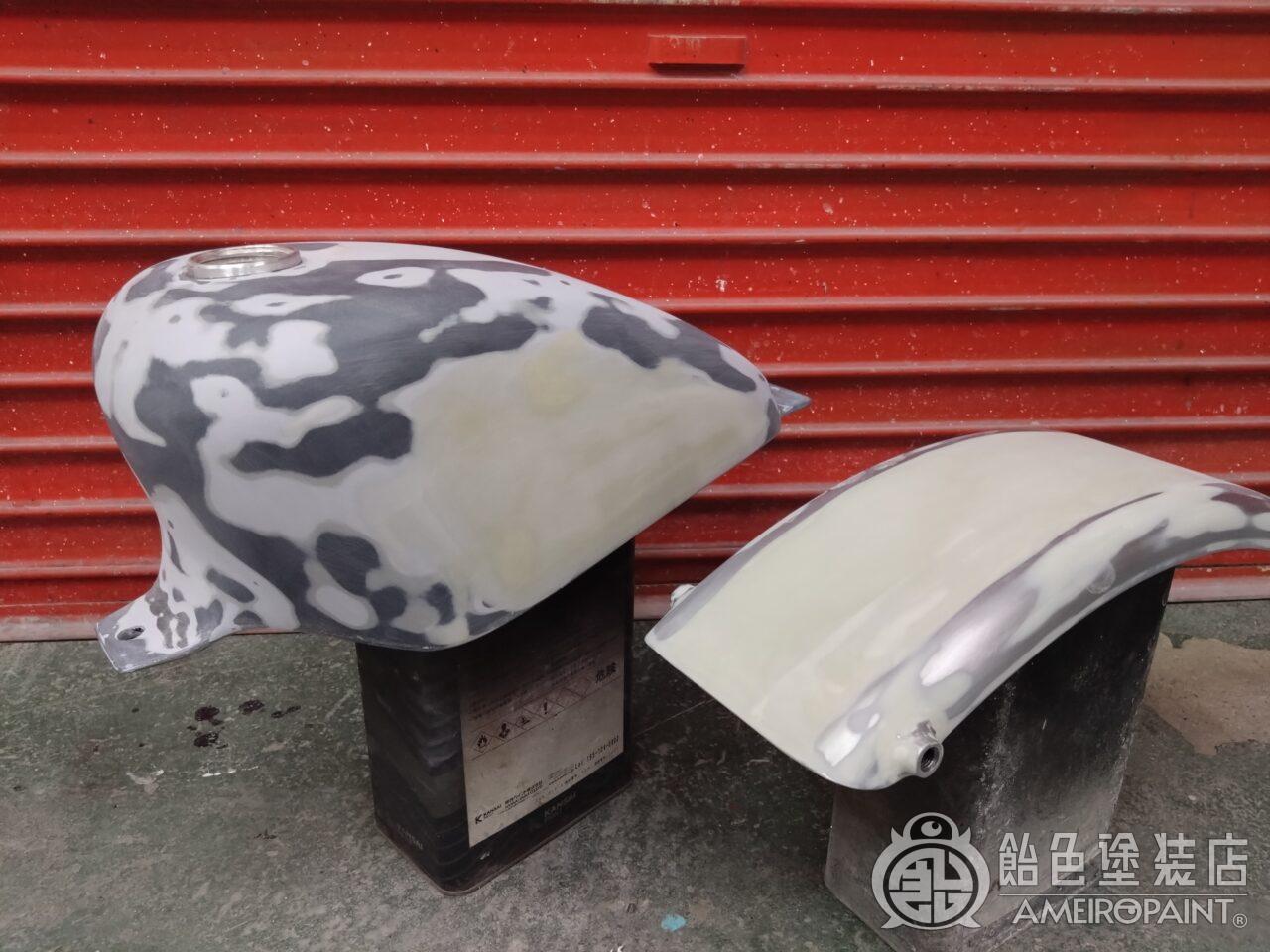 目次 ドラッグスター400の持ち込み。 タンクとリアフェンダーをカスタムペイントです。 下地取り外し タンクはFRP製でした。リアフェンダーは結構ヤレていたので… 剥離 サンディング タンクもサンディング どちらも歪があったので面パテ プラサフ ソリッドブラック フレイムスマスキング 濁りホワイト マスキング剥がし 段消しクリアー 仕上げ段消し研き トップコートクリアー 肌落とし研き 完成PAINT GALLERY M-178 ヤマハ ドラッグスター【細フレイムス】 painted by SATORU HATANO ペイント工程 バイク Share Post Pin It Hatena Pocket LINE