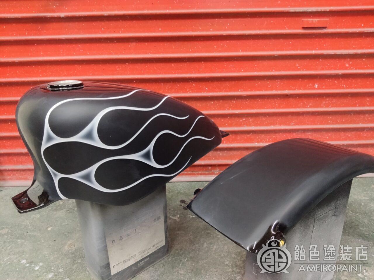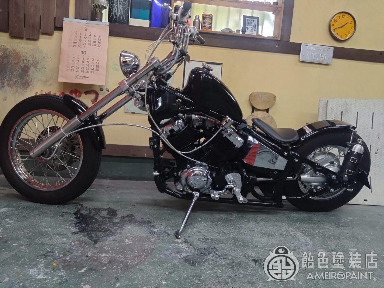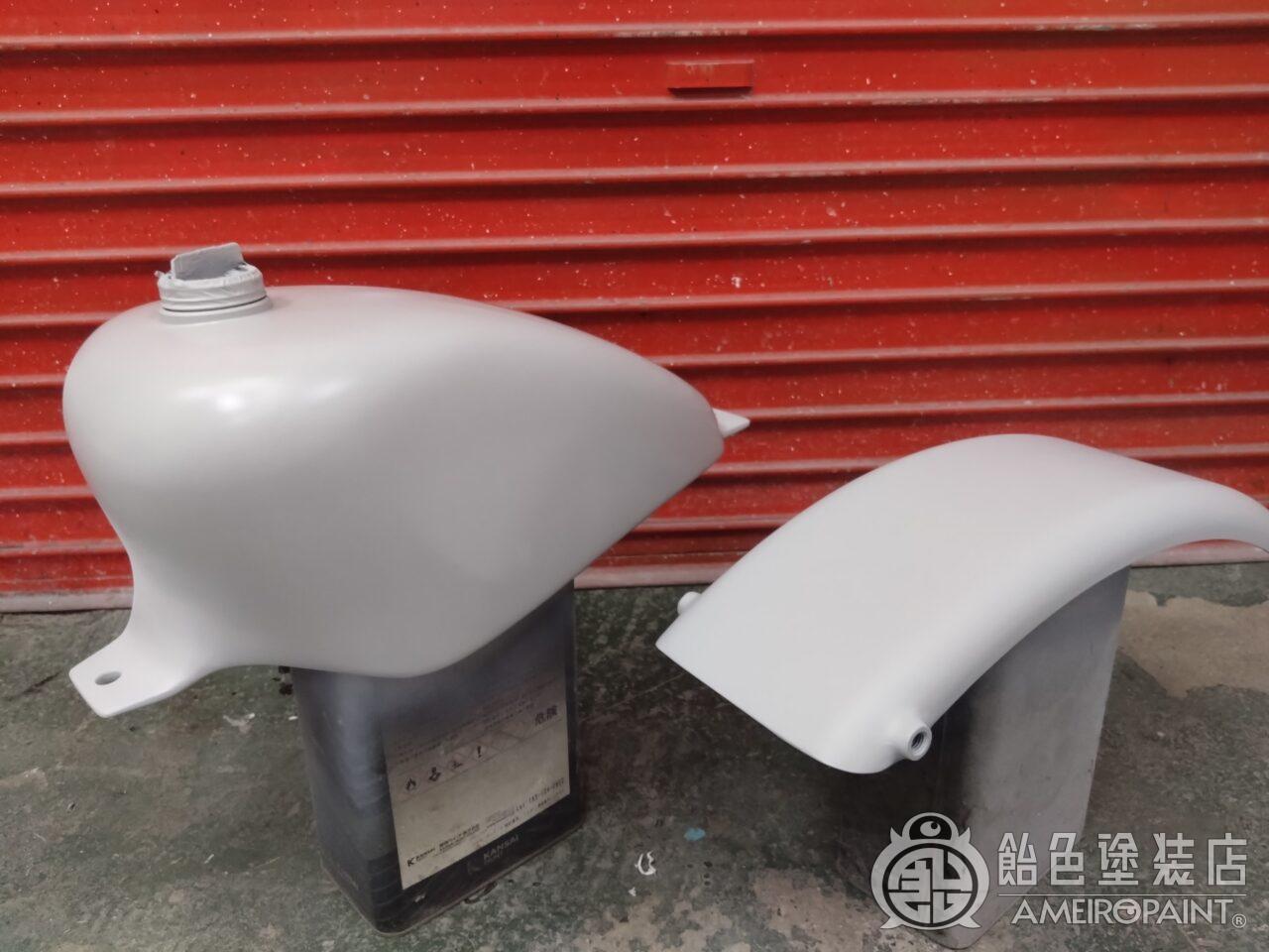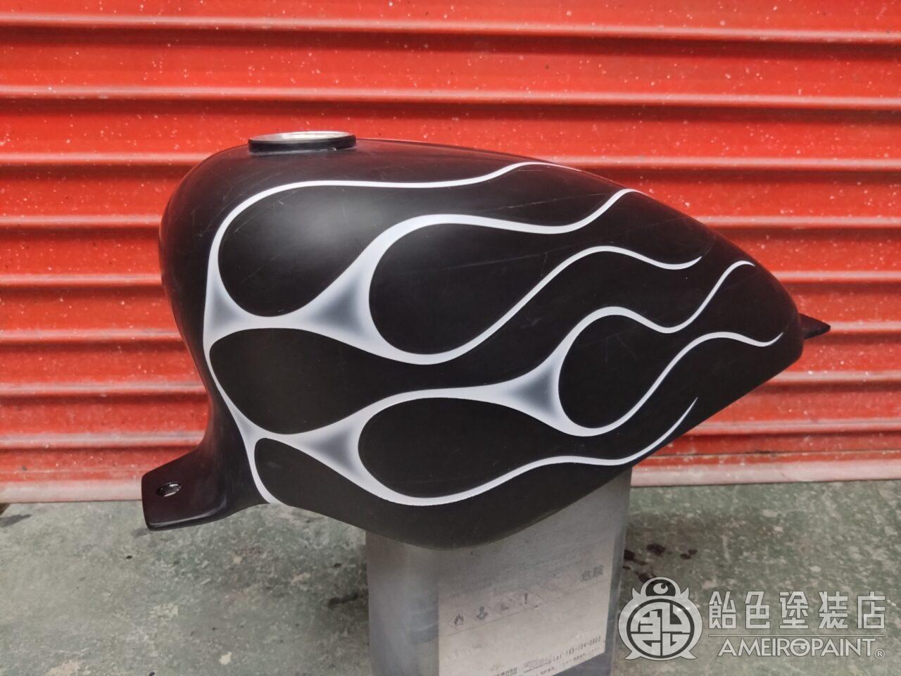 目次 ドラッグスター400の持ち込み。 タンクとリアフェンダーをカスタムペイントです。 下地取り外し タンクはFRP製でした。リアフェンダーは結構ヤレていたので… 剥離 サンディング タンクもサンディング どちらも歪があったので面パテ プラサフ ソリッドブラック フレイムスマスキング 濁りホワイト マスキング剥がし 段消しクリアー 仕上げ段消し研き トップコートクリアー 肌落とし研き 完成PAINT GALLERY M-178 ヤマハ ドラッグスター【細フレイムス】 painted by SATORU HATANO ペイント工程 バイク Share Post Pin It Hatena Pocket LINE
