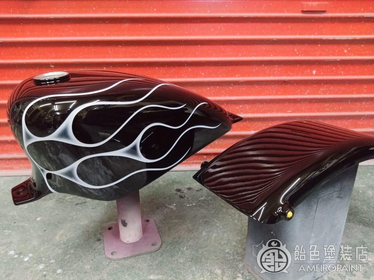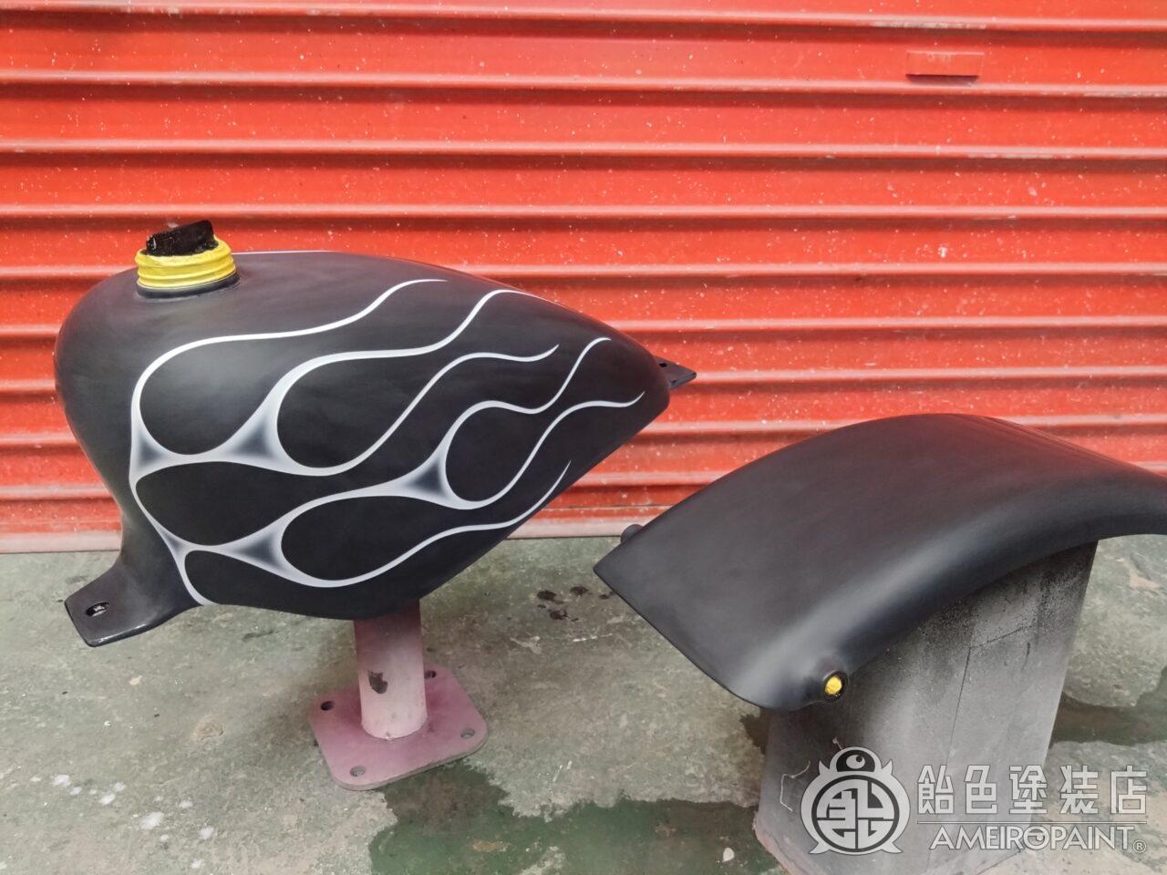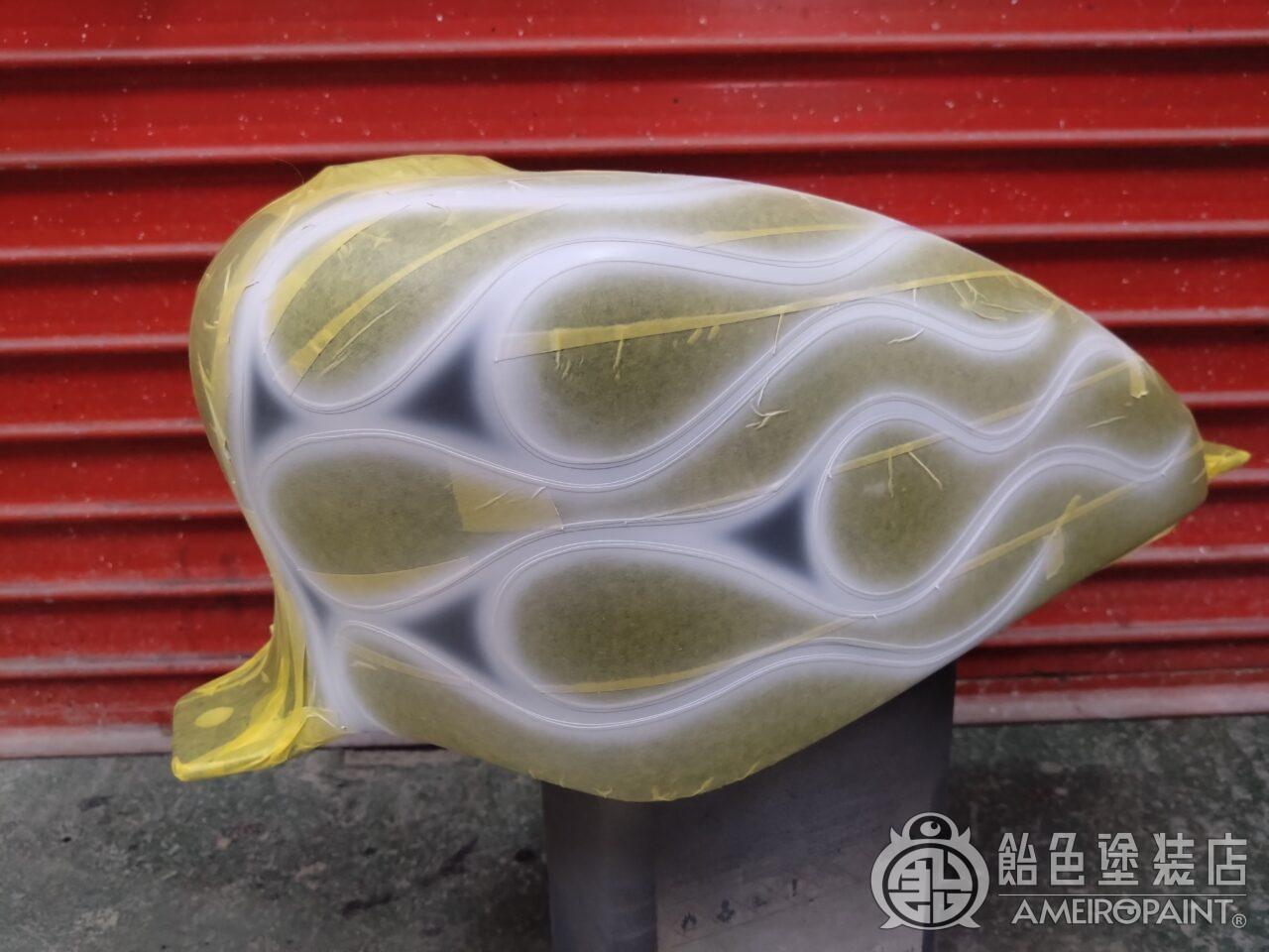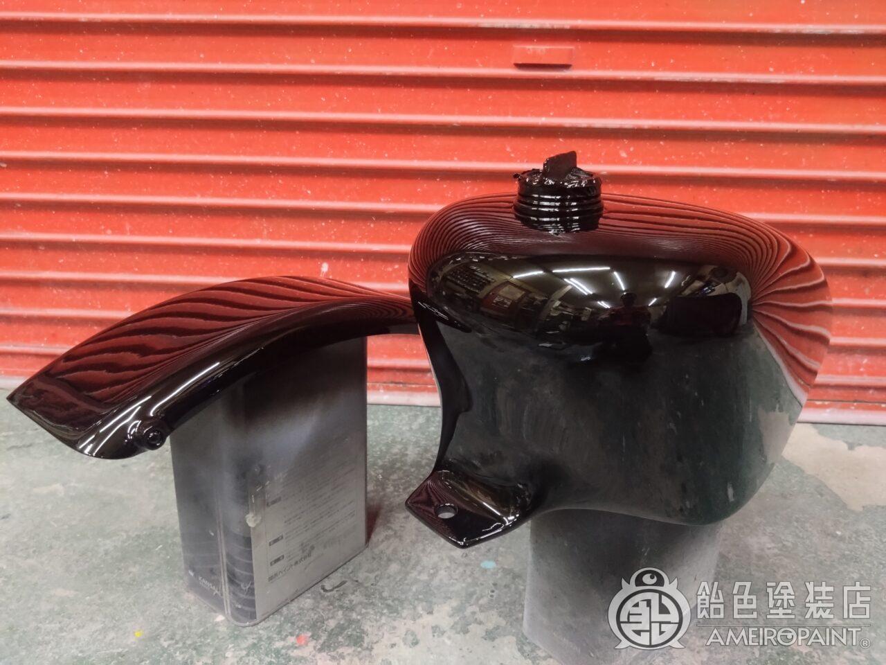 目次 ドラッグスター400の持ち込み。 タンクとリアフェンダーをカスタムペイントです。 下地取り外し タンクはFRP製でした。リアフェンダーは結構ヤレていたので… 剥離 サンディング タンクもサンディング どちらも歪があったので面パテ プラサフ ソリッドブラック フレイムスマスキング 濁りホワイト マスキング剥がし 段消しクリアー 仕上げ段消し研き トップコートクリアー 肌落とし研き 完成PAINT GALLERY M-178 ヤマハ ドラッグスター【細フレイムス】 painted by SATORU HATANO ペイント工程 バイク Share Post Pin It Hatena Pocket LINE