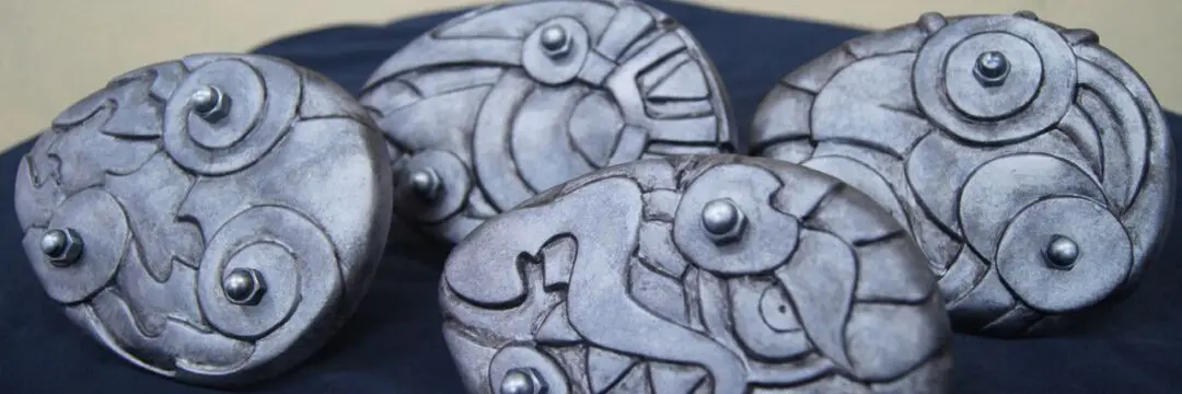1.5㎜鉄板をベースにパテを盛り彫刻刀で彫った造形の一品物。