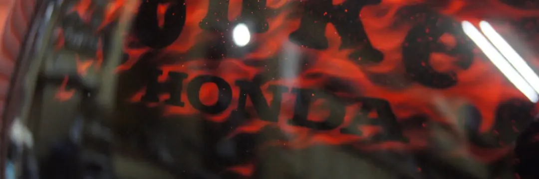 タンク両サイドには純正ロゴを模したベースにエアブラシでリアルフレイムスでオリジナリティ。
