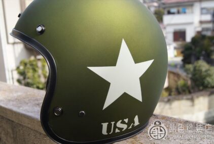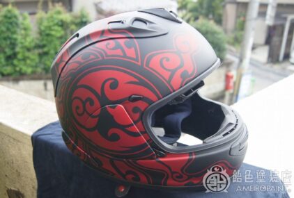 メット下部はラップペイントでキャンディレッドでアクセント。